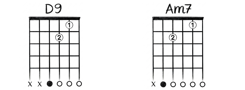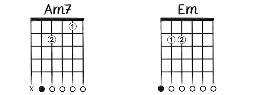 Acorde 1 (Am7): O mesmo que você aprendeu acima (Dedo 1 na casa 1, corda 2; Dedo 2 na casa 2, corda 4).