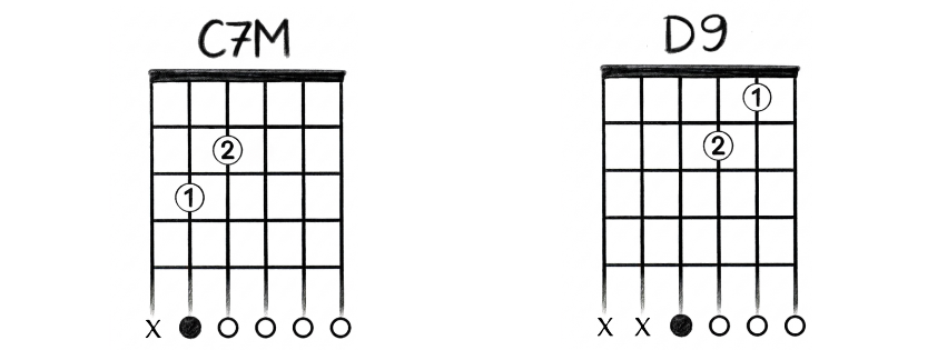 Acorde 1 (D9): Dedo 1 na casa 1, corda 2; Dedo 2 na casa 2, corda 3.